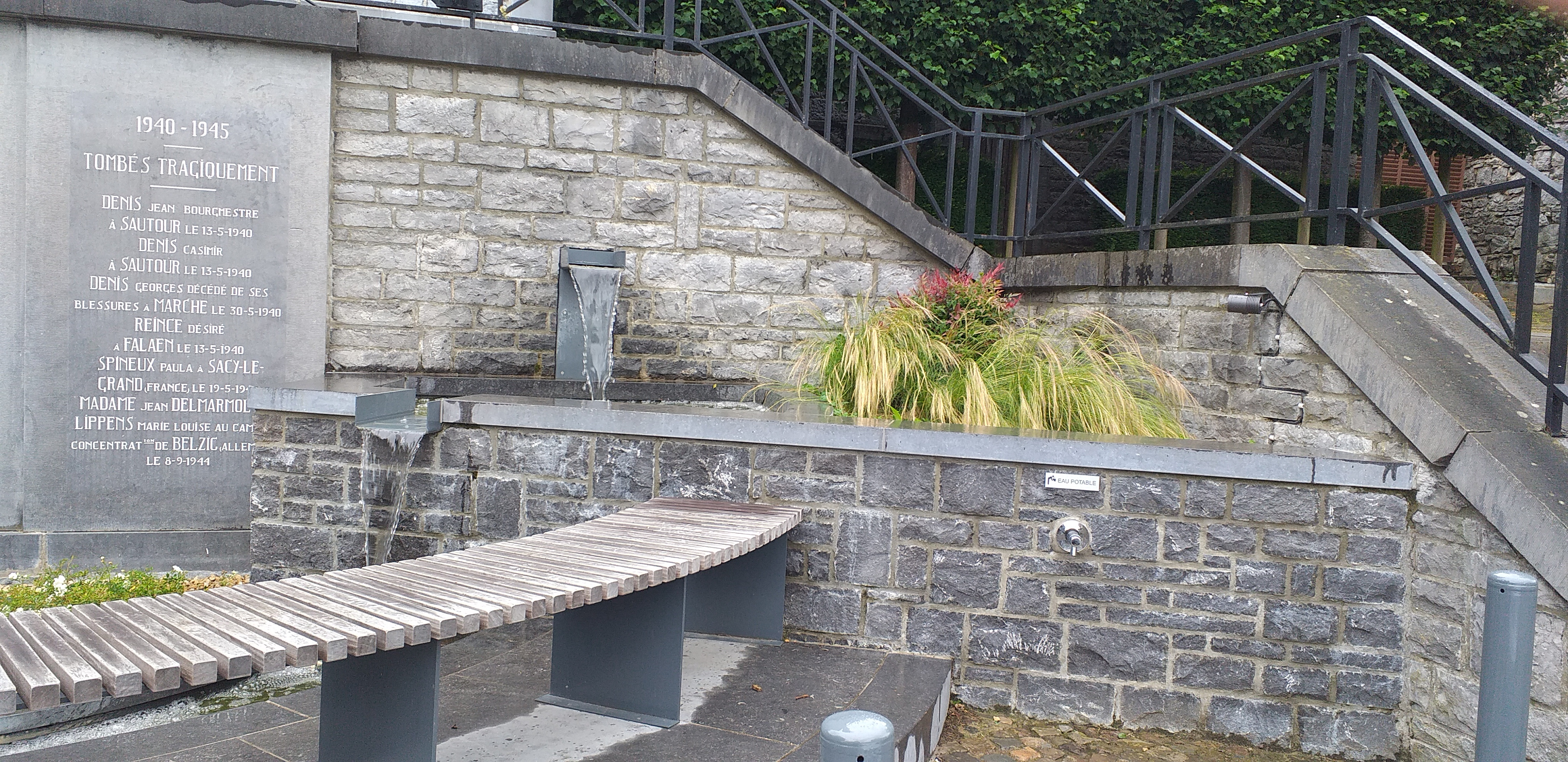 - le robinet avec plaquette " eau potable" au dessus se trouve près des escaliers de droite face à l'église.